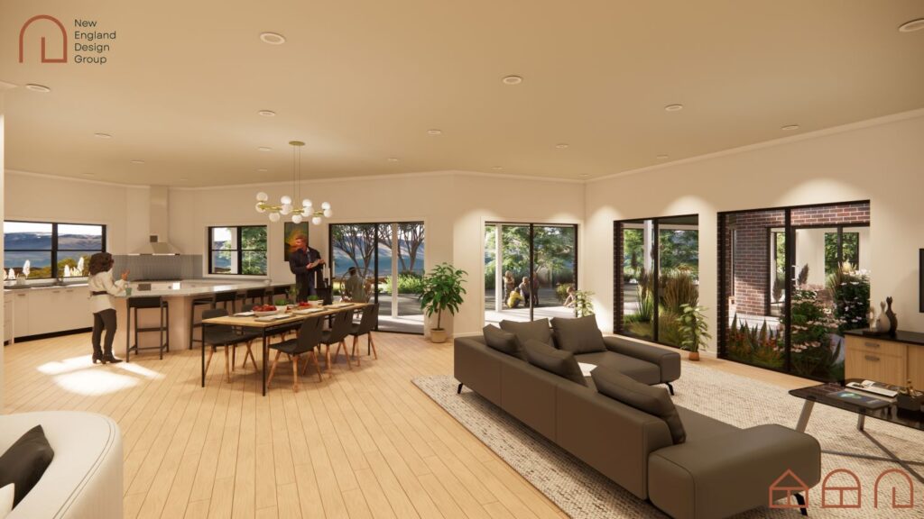 Brookside is a rural residence for a grazier and his extended family. Set on a ridge-top that commands sweeping views to the river valley below and beyond to the Great Dividing Range, the home has large indoor and outdoor living areas made for family get-togethers and entertaining. There is a parents’ master suite and retreat separated from the main living area by a glass-roofed courtyard for added privacy from the main entertainment areas when the owner feels the need for a break.